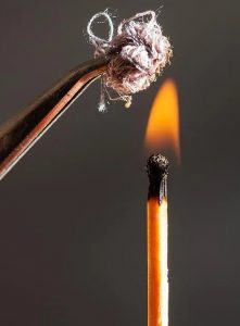 La viscose s’enflamme rapidement, générant un flash avec une flamme jaune, comme le coton. Sa combustion dégage une odeur faible, comme celle d’un morceau de papier journal enflammé. Les fibres de polyester laissent une cendre noire, dure au toucher après avoir refroidi et d’un aspect brillant. Le polyester brûle plus rapidement que la viscose et dégage une flamme bleue, sa structure semble fondre et crépite un peu. La combustion de fibres de polyester dégage une odeur vinaigrée, légèrement aigre, qui prend au nez.